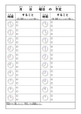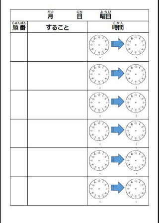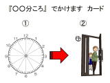 プリント上の勉強も大切なのですが、生活の中にその成果を活かしていくという視点はとても大切です。このプリントはA4にNアップ印刷(2枚)してリビングなどに常備していただき、出かける時間を書き込んでコミュニケーション補助としてしようしていただくことを前提に作成してあります。5分ごとにガイド線が引いてありますので「○○分ごろ」を「プラス・マイナス5分」としていただいてもいいですし、もっと幅を広げていただいても構いません。ただし、取り組み初期ほど、一度決めたプラスマイナス○分を大人側がきっちりと守ることに努めてください。大人がファジーすぎてはいけません!(笑)