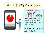 「ちょっと待って」は日常の中でよく使う、如何様に出も意味が採れる「便利な言葉(マジックワード)」なのですが、特に自閉スペクトラム症のある人の中にはこのマジックワードが苦手な人が少なくありません。そこで、普段から「ちょっと待って」と言う場合には「1分位のことだよ」と説明し、それ以上に待たせてしまう場合には「○分だよ」と具体的に提示していきましょうと。それに伴って、「ちょっと待って」の1分を練習するシート。