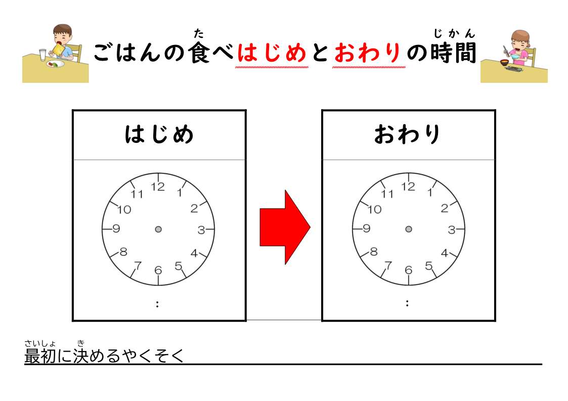 「もー、いつまで経っても食べ始めない!」「もー、いつまで経っても食べ終わらない!」…分かりますー(涙)。でも後々のバトルで小言を言っても何の良いこともないんです。こういうモノは食べ始める前に伝えておくことが鉄則。「この時間から食べ始めようね」「この時間には食べ終わろうね」を伝えるシートです。時計の横に提示すると良いですよ。