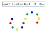 定位課題です。2cmのドットシールをプリントの点をよーく見て、貼って学習します。色の弁別も含みます。