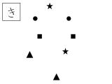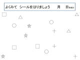 定位課題です。2cmのドットシールに予め☆、□、×、△、○を油性のマジックで書いておく下準備が必要です。プリントの印をよーく見て、貼って学習します。