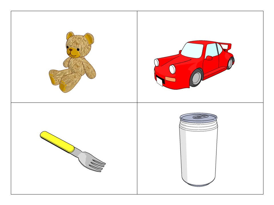 次の段階は具体物と絵カードのマッチングになります。抽象的なイラストを使うと「別物」になってしまう子がいますので、気をつけて下さい。右の画像に一例としての4つのカードを添付してあります。最初は2択。次に3,4…とステップを踏むと良いと思います。